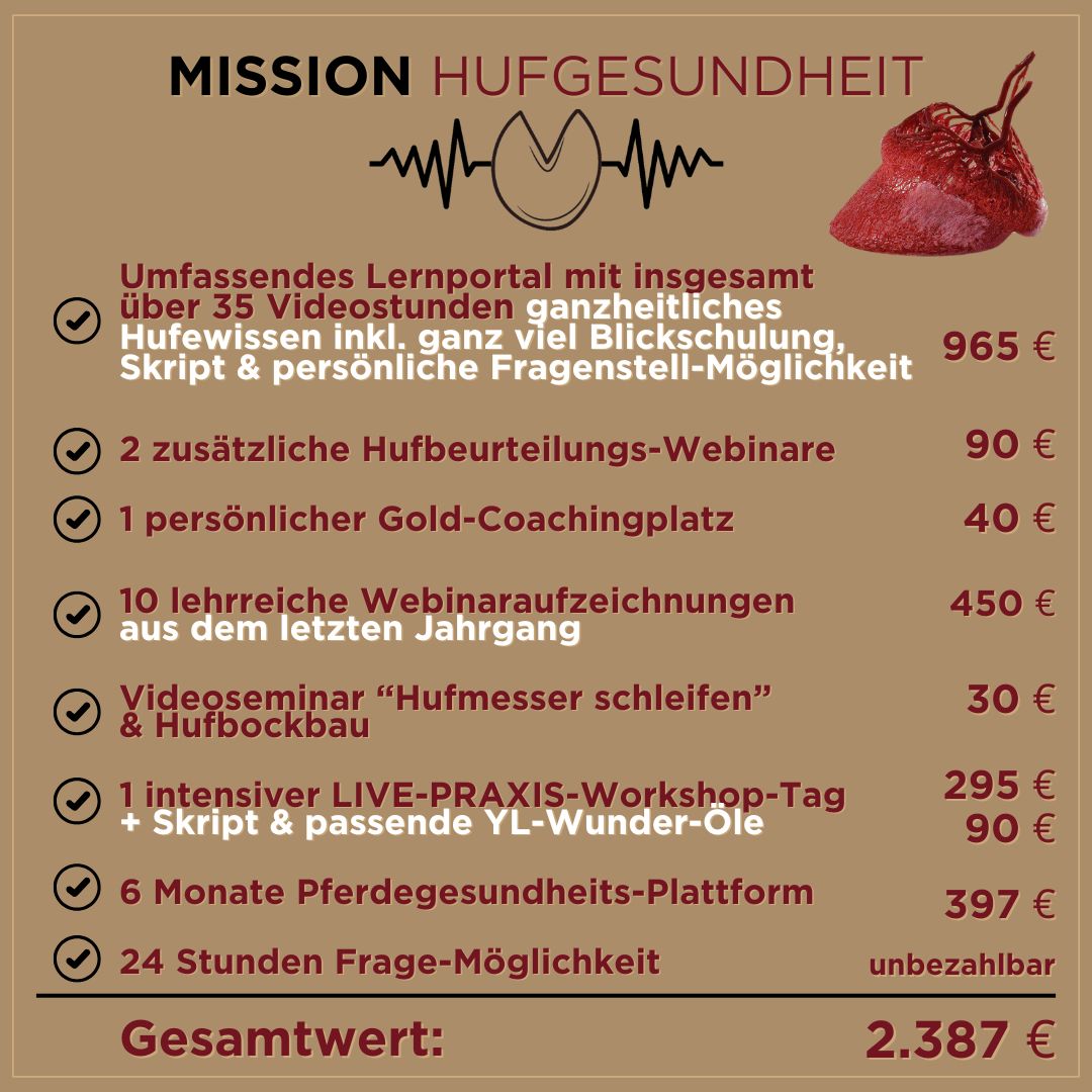- 1 persönlicher Gold-Coachingplatz in den Hufbeurteilungs-Webinaren oder auf Skool