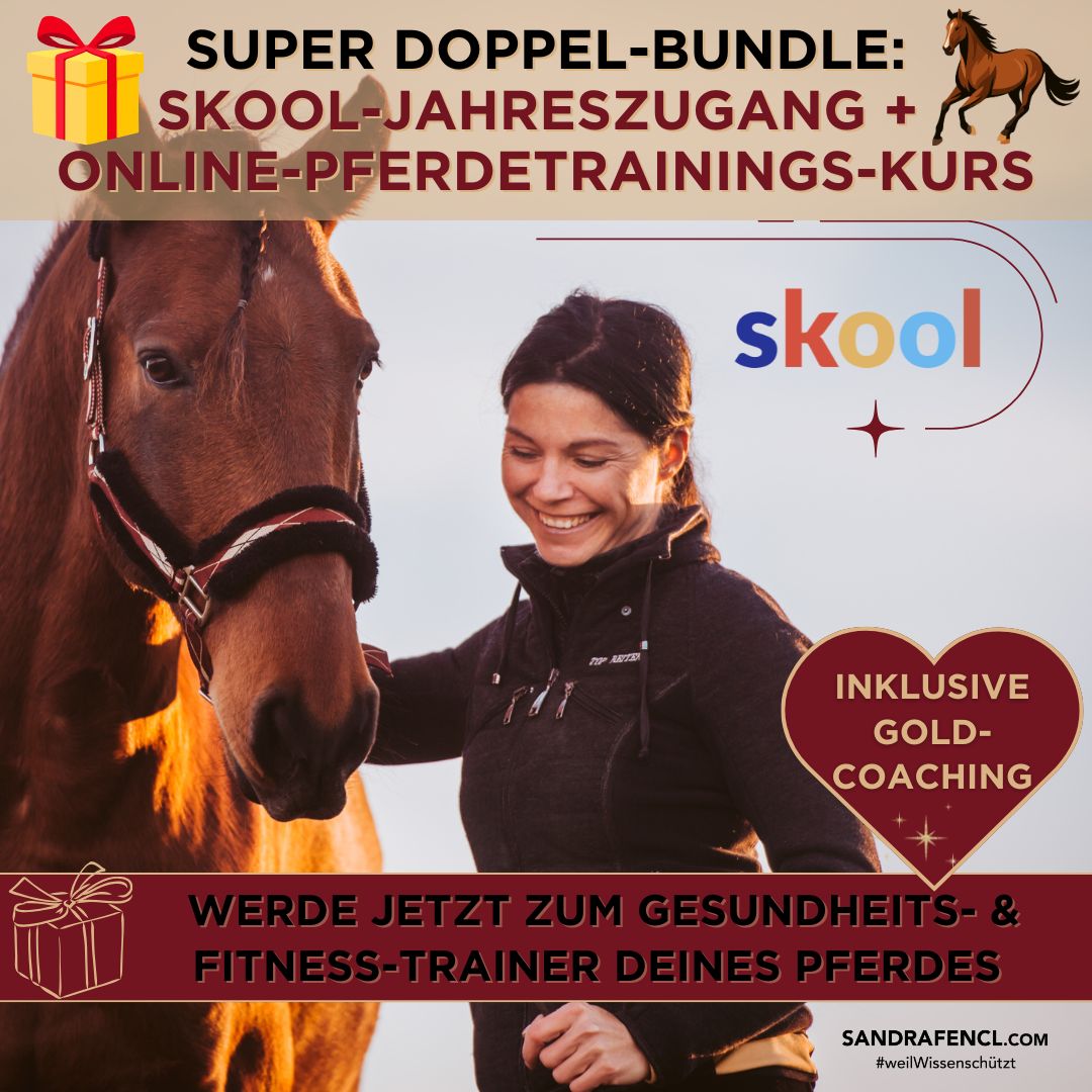 HERZLICH WILLKOMMEN zum sensationellen Doppel-BUNDLE: Du erhältst hier Deinen Pferdegesundheits-Plattform & Community JAHRES-Zugang auf SKOOL und das umfassende Intensiv-Onlineseminar "Kreatives Balancetraining, Pferde-Ergotherapie auf Profi-Niveau, Mentaltraining, Extreme Trail Training, Podestarbeit, sowie sicheres Verladen und entspanntes Transportieren von Pferden. Und damit ALLES, was Du brauchst um Dein Pferd in jeder Lebenslage gesund, fit und motiviert zu erhalten! ✨🤗🐎🙌