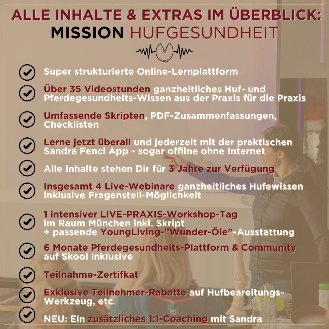 Frei nach dem Motto #weilWissenschützt ist es für jeden Pferdebesitzer wirklich essentiell, umfassendes theoretischen sowie praktisches Wissen rund um die Hufgesundheit zu haben. So kannst Du Deinem vierbeinigen Liebling nicht nur viel Leid, Schmerzen, Schonhaltungen und etwaige Lahmheiten sondern gf. sogar tiefgründige Hufkrankheiten wie Hufrehe oder Hufrollen-Entzündung ersparen, und die Gesundheit und Hufbalance Deines Pferdes kompetent und ganzheitlich unterstützen! 🐎💪🏼